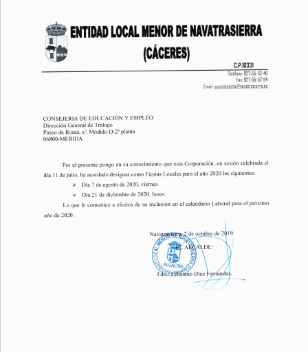 Calendario de Fiestas Locales en Navatrasierra para el 2020